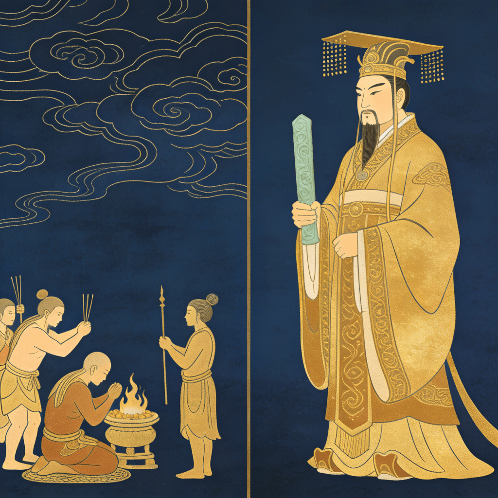 In ancient times, heaven and earth were connected, and humans and gods lived together in chaos. To restore order, Emperor Zhuanxu ordered two gods, Zhong and Li, to separate heaven and earth, cutting off the direct communication between mortals and the divine. From then on, only dedicated shamans could communicate with heaven on behalf of humanity, marking the separation of divine and royal power and the establishment of a hierarchical social order.